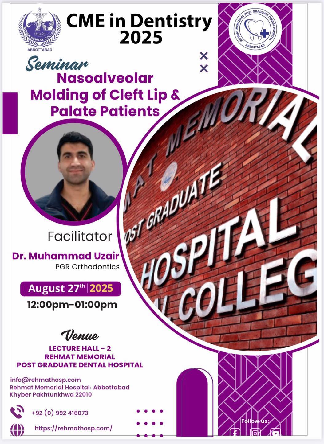 Rehmat Memorial Post Graduate Dental Hospital, Abbottabad, organized a seminar on “Nasoalveolar Molding of Cleft Lip & Palate Patients” on August 27, 2025.