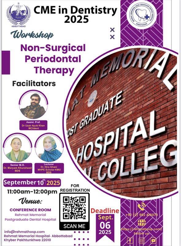 Hands-On Workshop on Non-Surgical Periodontal Therapy A hands-on workshop on Non-Surgical Periodontal Therapy was conducted at Rahmat Memorial Hospital, Abbottabad. Dr. Uzair, Dr. Hira Ghani, and Dr. Maryam led the session, providing practical training and clinical insights to participants.The workshop enhanced skills in periodontal care techniques, reinforcing professional development in […]