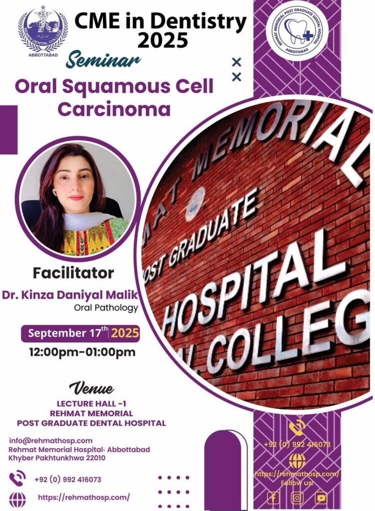Glimpses from the CME in Dentistry 2025 seminar on Oral Squamous Cell Carcinoma, held at Rehmat Memorial Post Graduate Dental Hospital, Abbottabad. The session was facilitated by Dr. Kinza Daniyal Malik (Oral Pathology) and provided an insightful discussion on oral carcinoma.A big thank you to all participants for making this […]