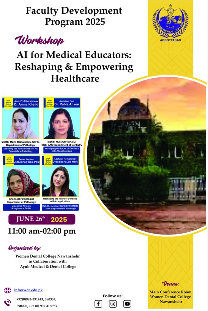 WDC Workshop on AI for Medical Educators On 26 June 2025, Women Dental College Abbottabad in collaboration with Ayub Medical and Dental College Abbottabad hosted an AI workshop for medical educators in its IT Conference Room. Asst. Prof. Dr. Amna Khalid, Asst. Prof. Dr. Rabia Anwar, Senior Lecturer Dr. Rubina […]