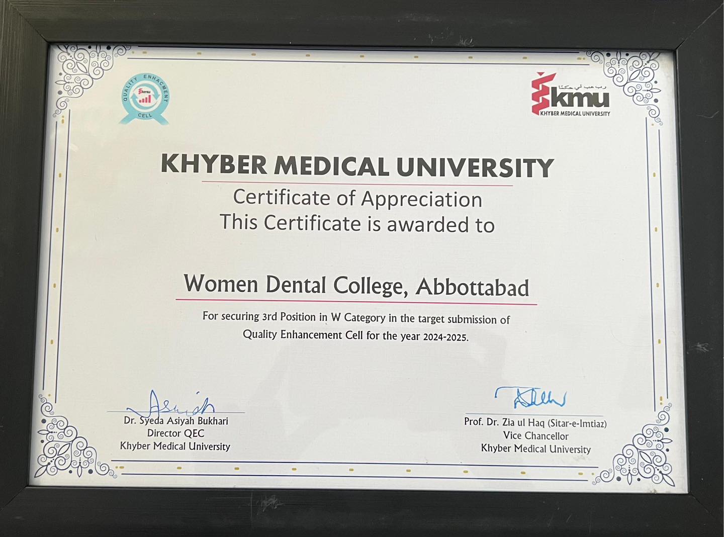 QEC KMU organized the Quality Award Ceremony on 27 November 2025, where Women Dental College proudly secured 3rd position among all the affiliated medical and dental colleges of Khyber Medical University.